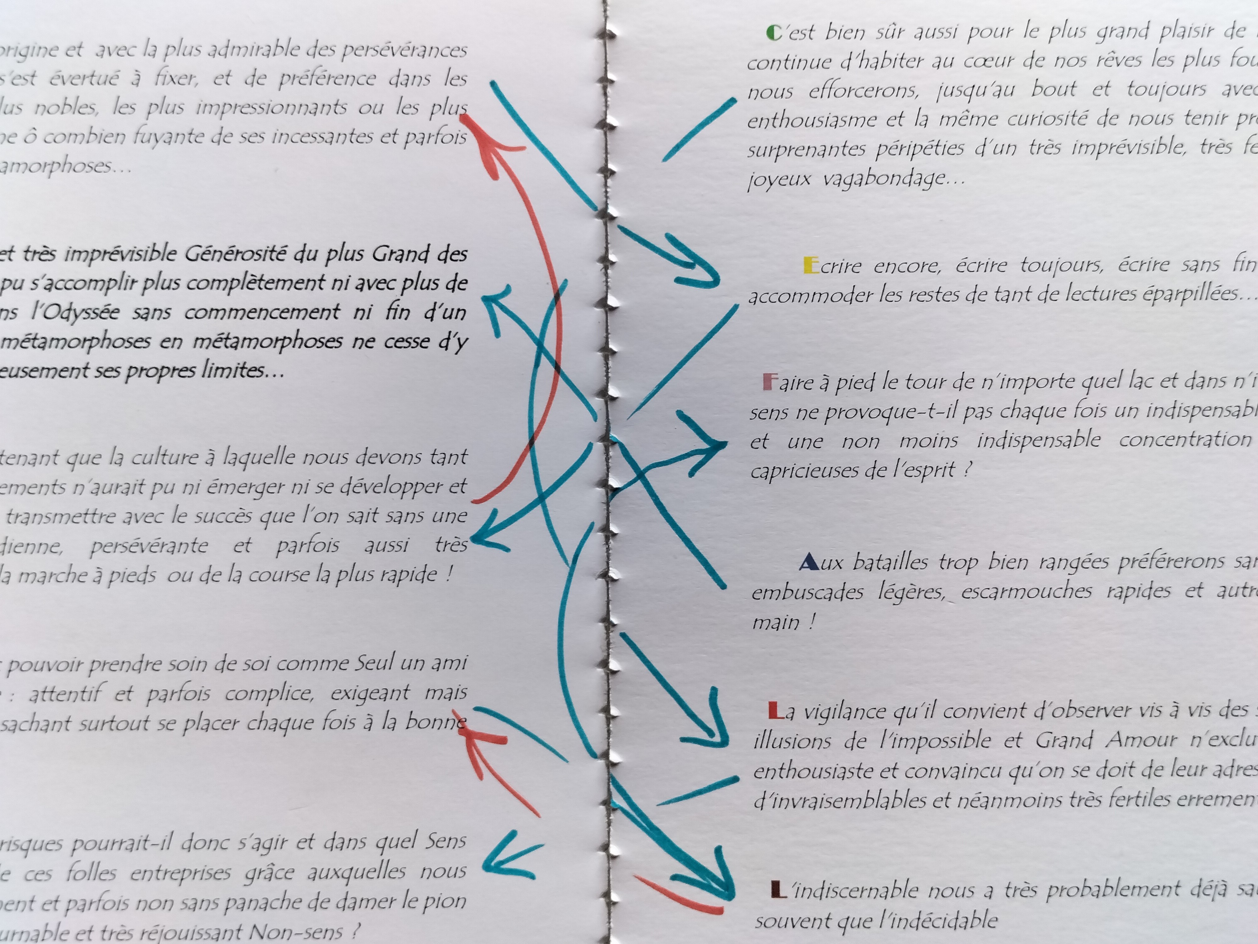 D’une part on pourrait dire que le déroulé diachronique d’une lecture linéaire est constamment entravé sinon même brisé par la brièveté des aphorismes et la variation des thèmes abordés, même si cette variation ou cette fragmentation suit en grande partie la chronologie de l’inspiration et se maintient dans le cadre d’un ensemble assez déterminé de thèmes… Ce morcellement est ensuite utilisé au niveau de la mise en page pour permettre la coexistence synchronique d’un ensemble restreint d’aphorismes. Au niveau d’une page les aphorisme se présentent les uns au-dessus des autres. Au moment du travail d’écriture et de réécriture c’est même l’unité d’une double page en vis-à-vis qui a fini par s’imposer. La présence d’une double page permet de tisser un réseau de relations synchroniques entre une dizaine d’aphorismes différents. Dans cet espace de présence ou de coprésence la lecture, qui d’ailleurs en tant que relecture immédiate accompagne toujours l’écriture, n’est pas complètement astreinte à la linéarité syntagmatique du message. C’est la pratique d’un écart constamment maintenu entre les aphorismes successifs qui favorise la promotion de cette dimension de synchronicité dans l’espace de la page ou de la double page. Cette coexistence dans le même espace offert au regard crée un réseau de relations synchroniques, un peu comme cela se passe pour un tableau ou un dessin ou encore pour les graphes ou les systèmes d’équations en mathématique, ou encore pour les partitions de la musique dite savante. Cette disposition met en valeur les espaces blancs ou vides séparant les différents aphorismes, espaces pouvant aussi valoir comme autant de silences et d’ouvertures sur l’inconscient… Dans mon travail à l’ordinateur j’ai fini par utiliser, pour les majuscules débutant chaque aphorisme, la police de caractère Broadway, un petit air de fête et de musique associé à ce nom n’étant pas étranger à ce choix typographique! Pour le reste du texte j’ai utilisé le caractère Tempus Sans ITC…